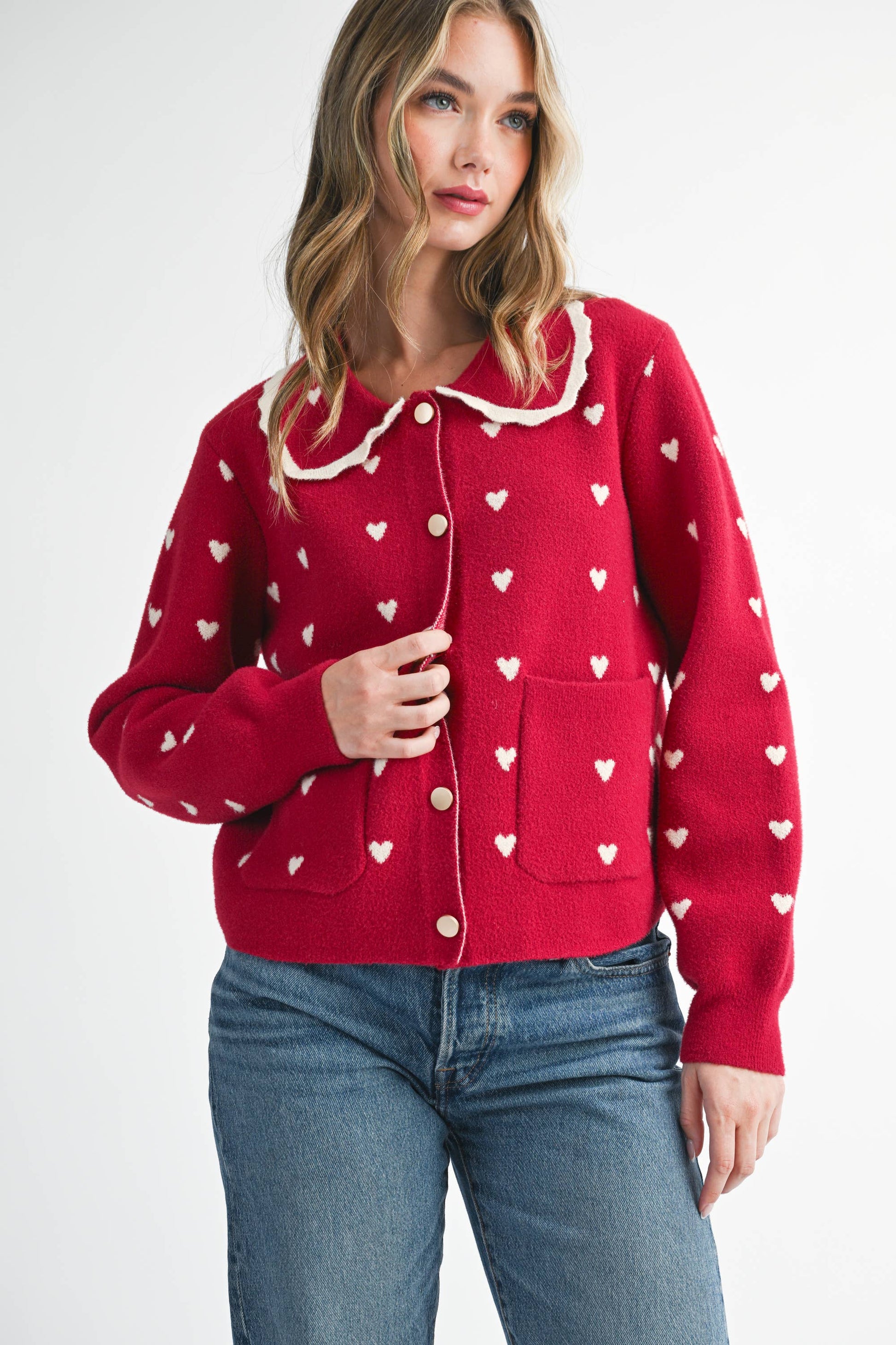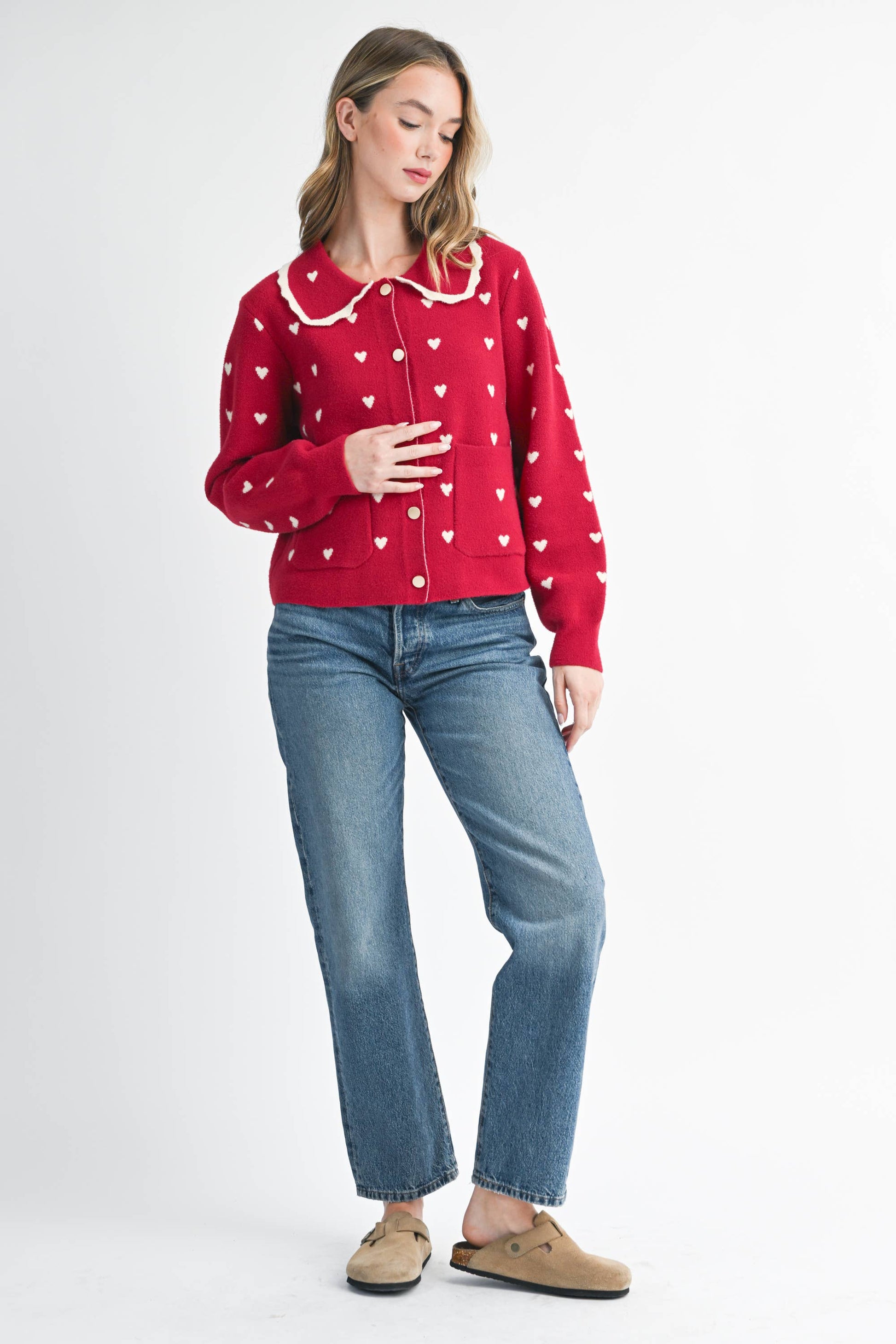A charming layer with vintage vibes—this cardigan features an allover heart knit, sweet collar trim, and front pockets. Soft to the touch and endlessly wearable, it’s a love letter to cozy dressing.