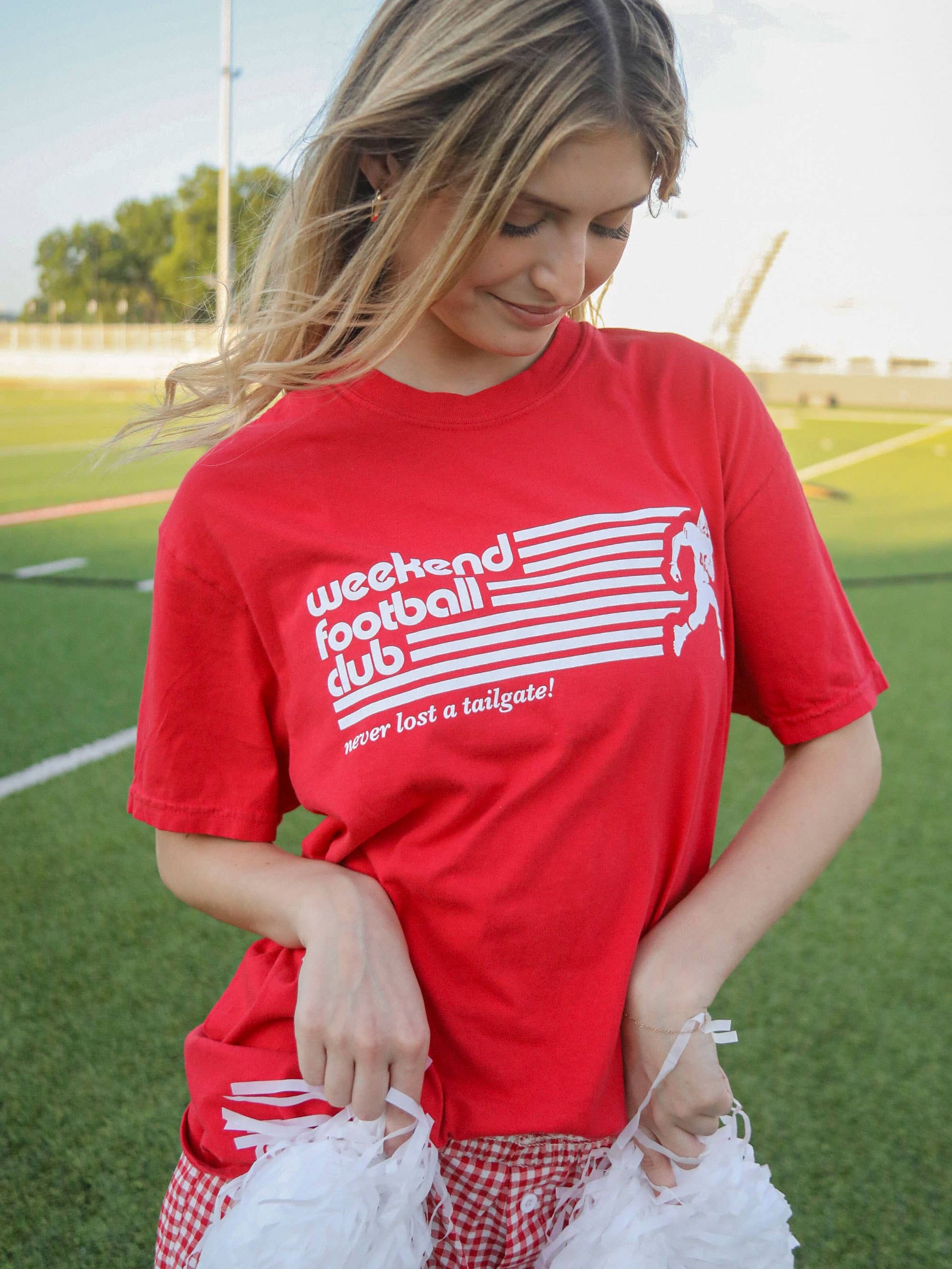 This red tee is giving vintage athletics with the running back going in for a touchdown and the groovy font. Oh, and we love the last line: "never lost a tailgate." Now who wouldn't want to be a part of that football club?