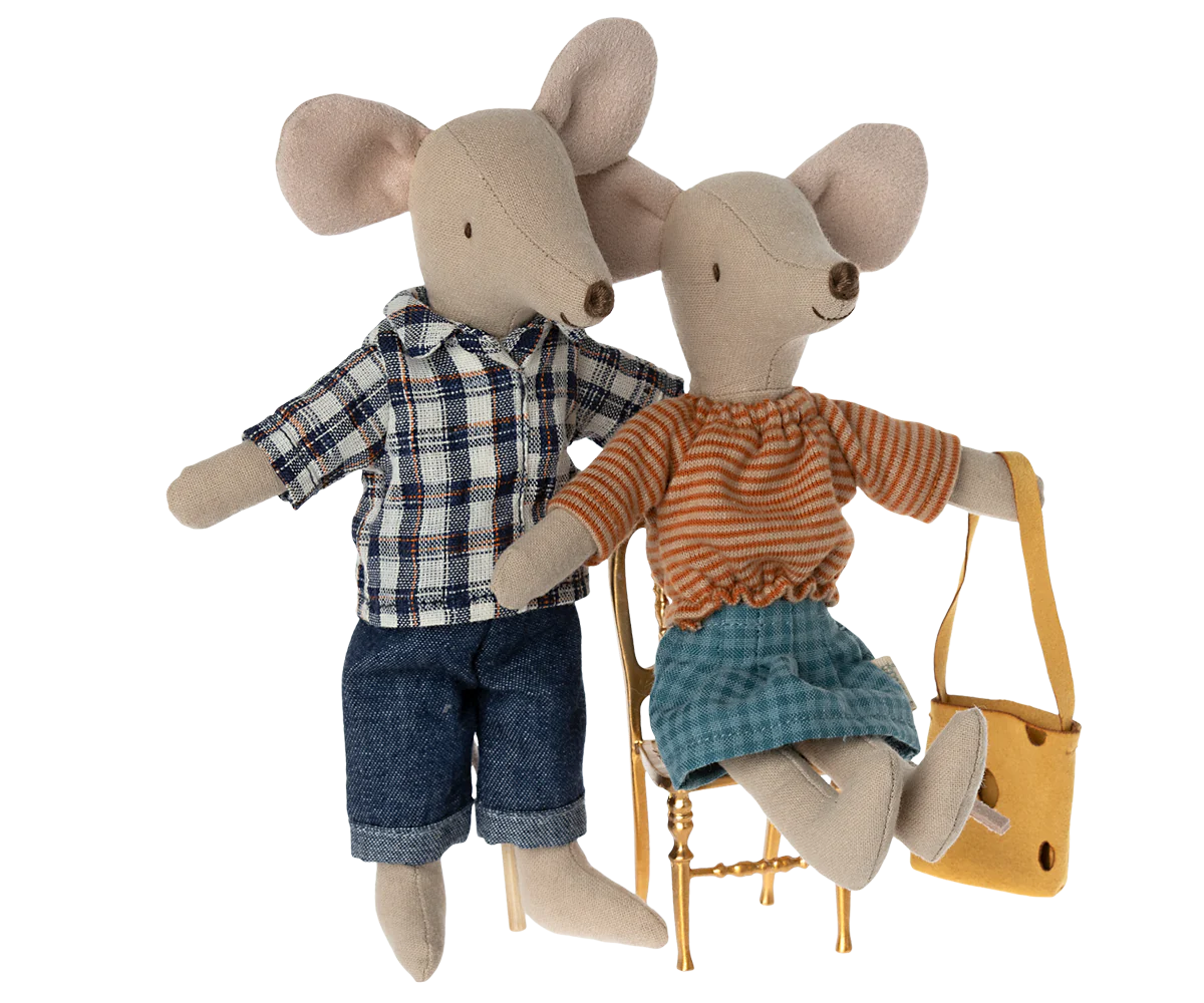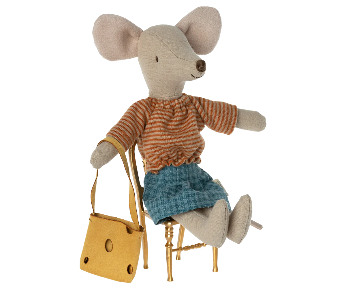A classic Maileg item; Mum mouse, now in new clothes. This mouse fits furniture and accessories in size mouse. Buy more clothes separately, clothes in size mum/dad fit this mouse.